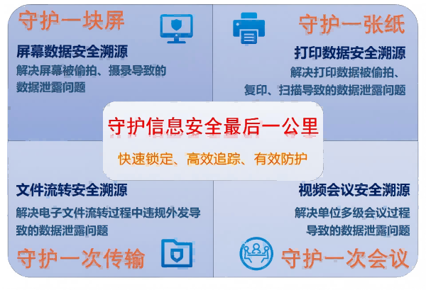 该产品是集团公司与中国科技大学专家团队联合研发的一款智能化产品,采用具有国际领先水平的多模态跨媒介隐形水印技术,实现了“守护一块屏、守护一张纸、守护一次传输、守护一次会议”等“四个一”。安装到电脑上,会对其所有信息加上一层“隐形水印”,无论是复印、扫描还是拍照、传输,一旦文件被非法传播,系统都能通过水印快速定位泄密源头。连接到视频会议系统上,其屏幕内容和声音被加上了“隐形水印”,一旦被偷拍或摄录泄露出去,系统能迅速锁定泄密设备、人员及时间等关键信息,精准定位泄密源头。产品能有效降低泄密风险,助力全面提升数据安全管理水平。